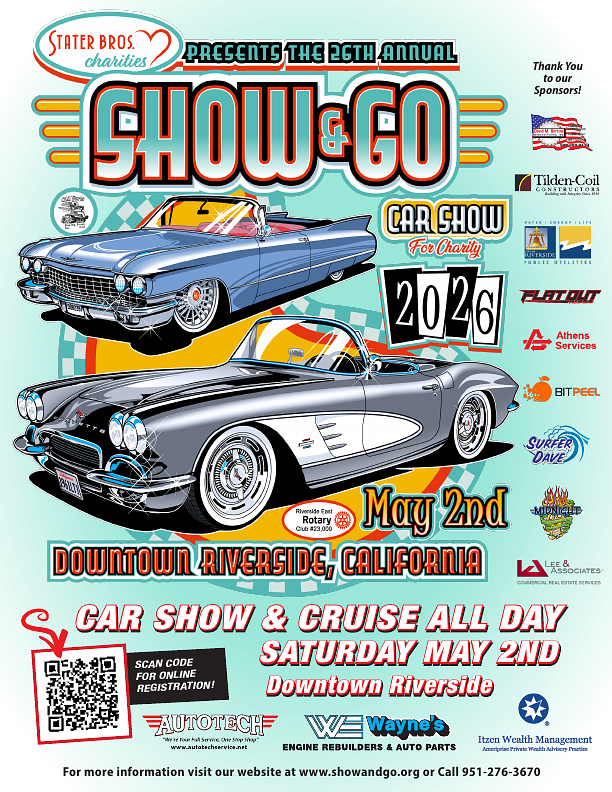 The Riverside East Rotary Club and the Old Farts Racing Team are excited to announce the return of the Show and Go Car Show in 2026. The event will be held on Saturday May 2nd this year in Downtown Riverside. We hope you'll join us for what is sure to be a great weekend.